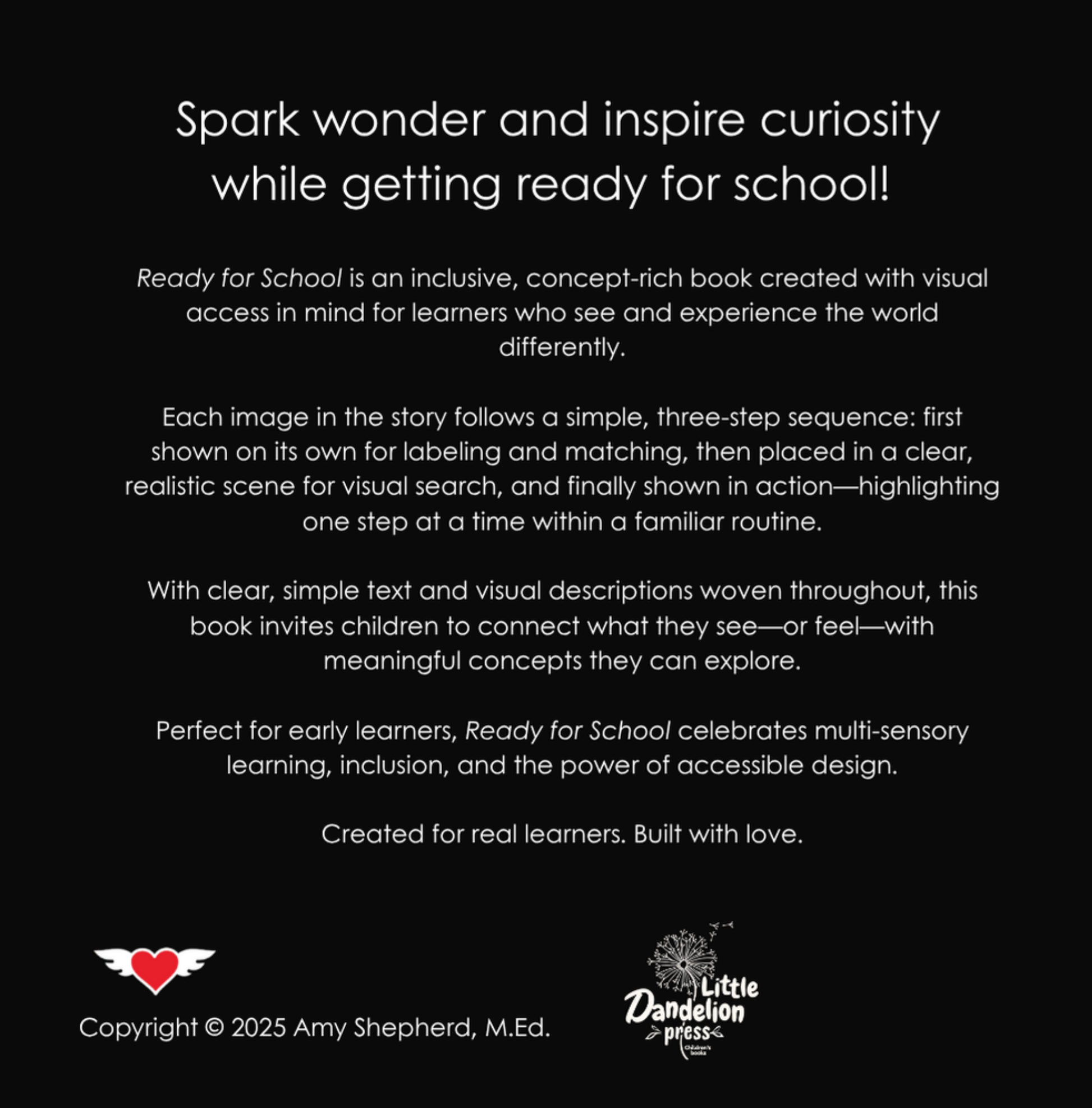 Ready for School is an inclusive concept book designed to support visual access, early language, and school readiness—especially for learners who see and experience the world differently.