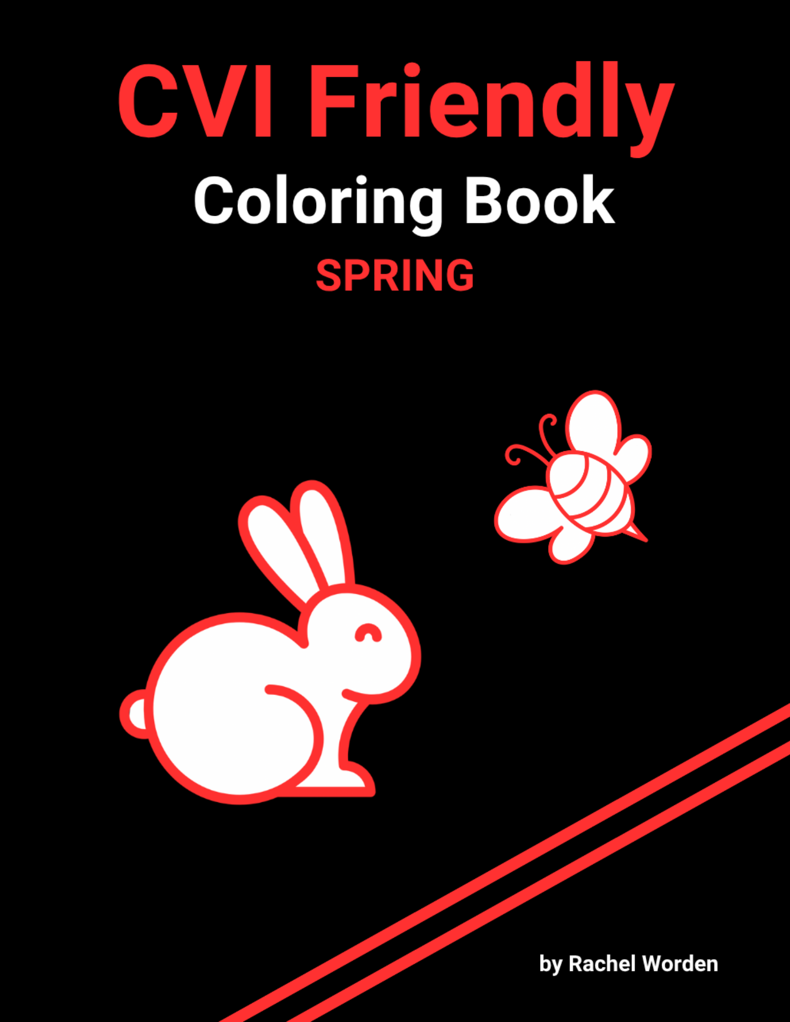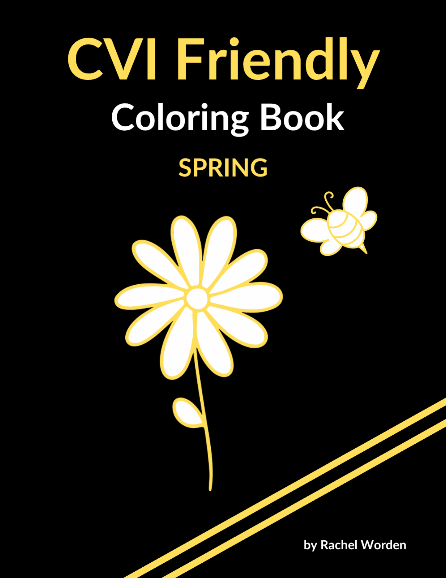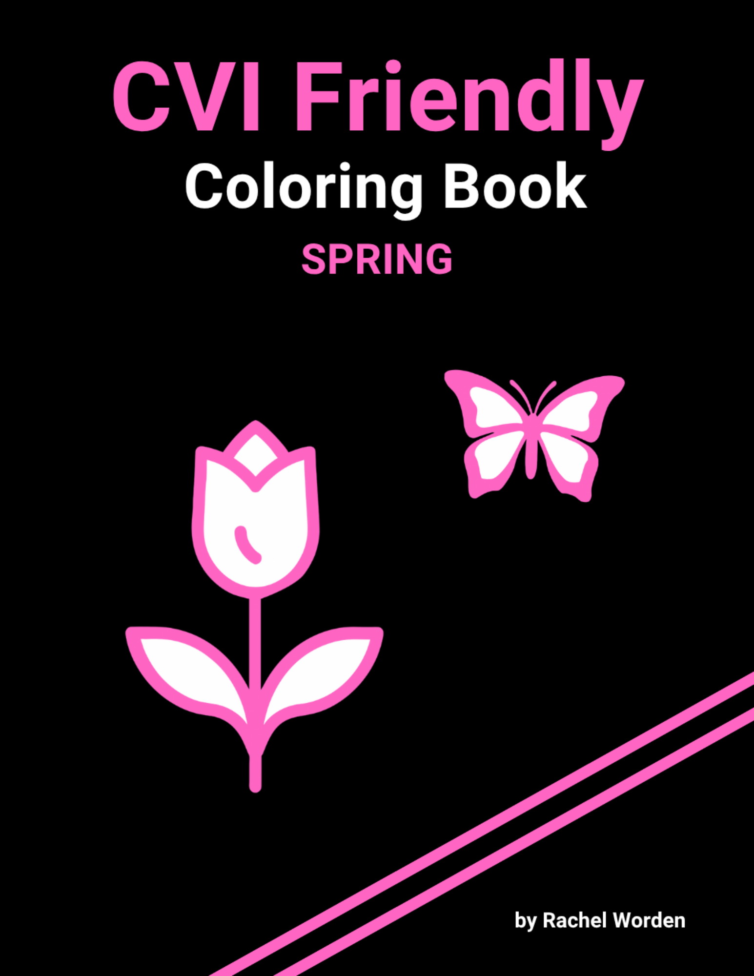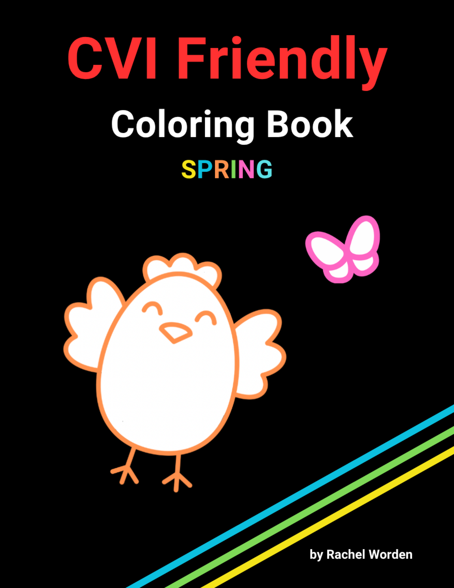 Designed specifically to be inclusive for individuals with Cortical Visual Impairment (CVI) and low vision, the SPRING TIME CVI Coloring Book uses high-contrast visuals on black backgrounds to enhance line visibility and visual tracking. Each page features a single simple spring-themed image outlined in bold colors—perfect for coloring without distraction.