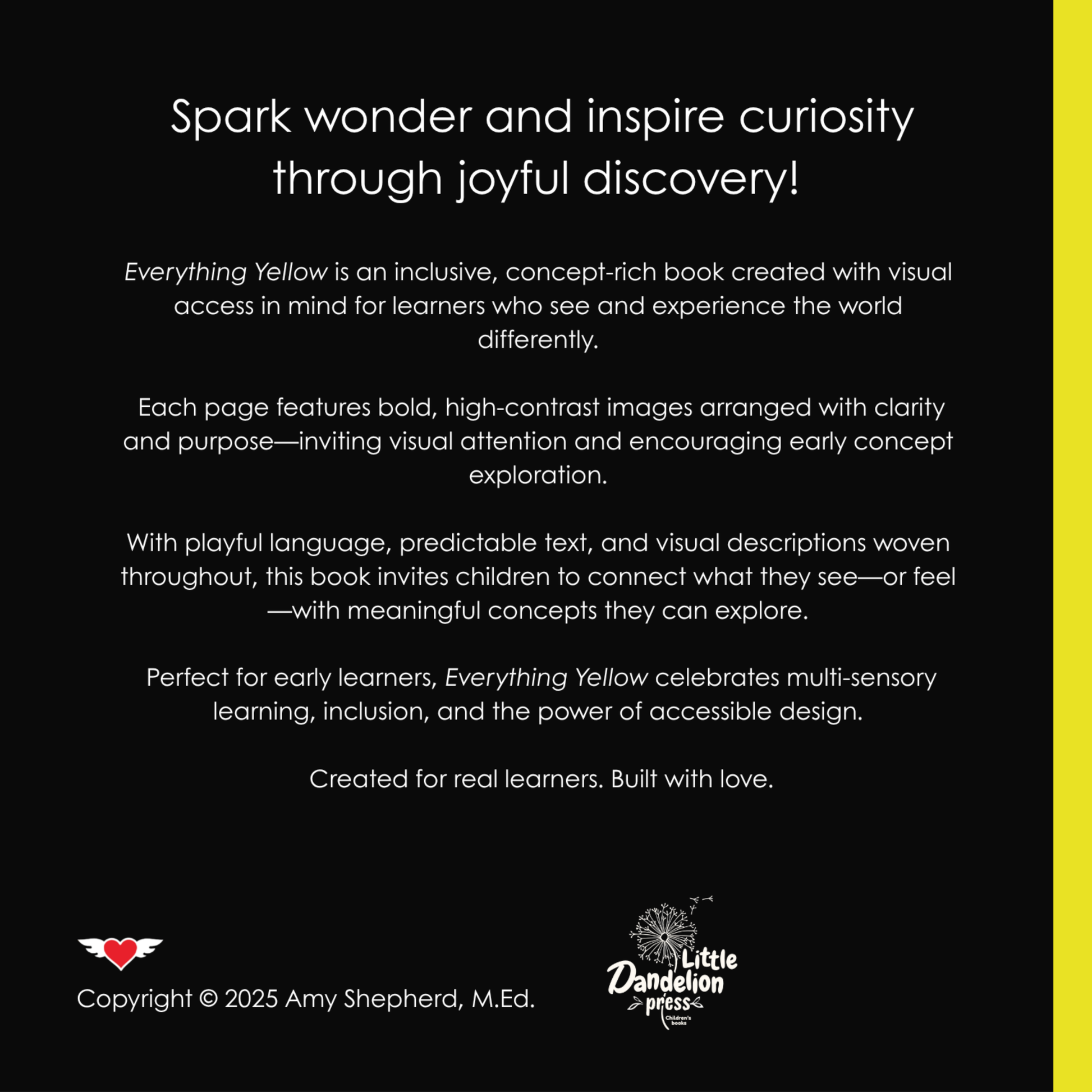 Created with visual accessibility at its core — including meaningful support for children with Cortical Visual Impairment (CVI) — this book uses high-contrast images, uncluttered layouts, and predictable language to help all learners notice, recognize, and enjoy yellow objects in their world.
