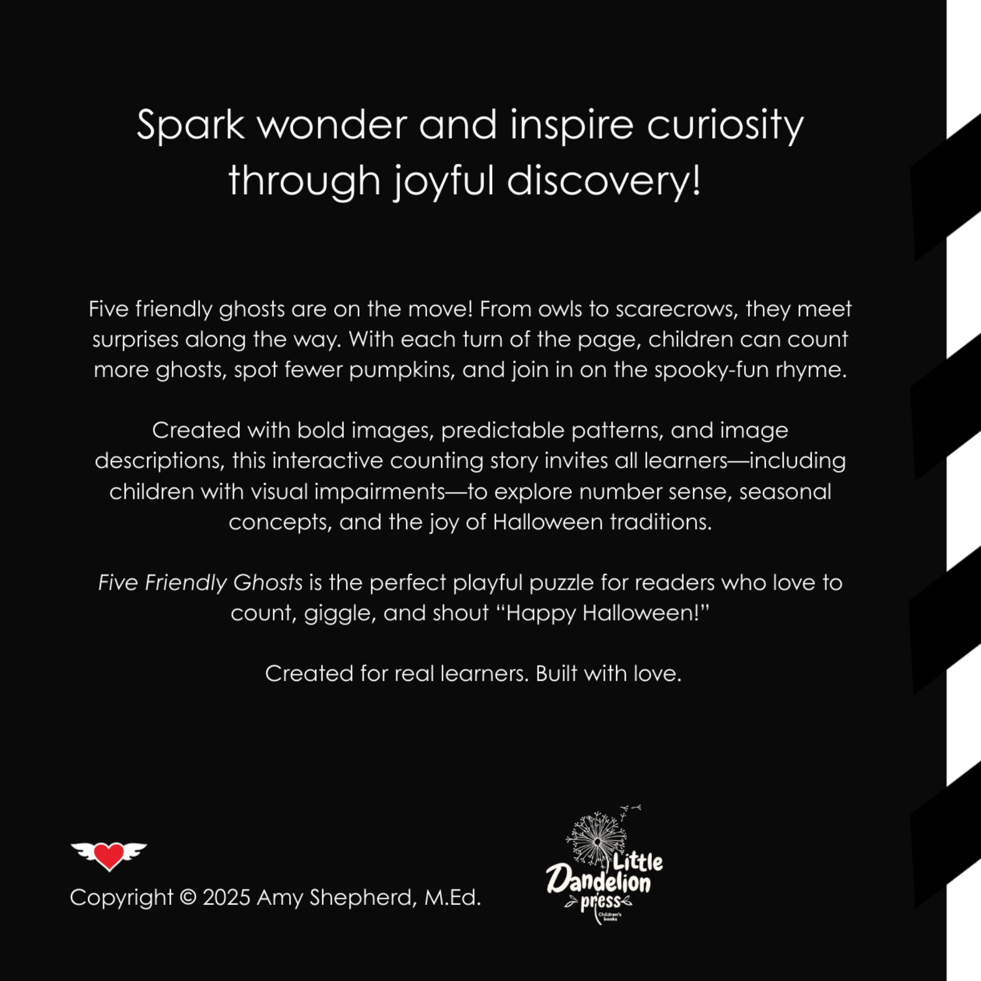Five Friendly Ghosts is a playful, inclusive Halloween counting book designed to bring the season’s fun to every child. With rhythmic rhyme, bold high-contrast illustrations, and uncluttered layouts, this story helps children practice number sense, build vocabulary, and engage joyfully in storytime.